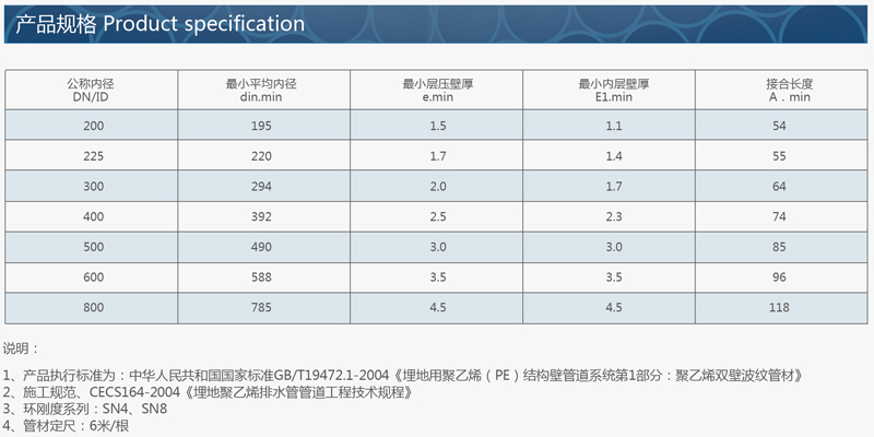 产品具有重量轻、抗压强度高、内壁光滑、排水阻力小、耐腐蚀、施工方便、连接可靠、使用寿命长等特点,是目前较为先进的排污、排水管道系统之一。
